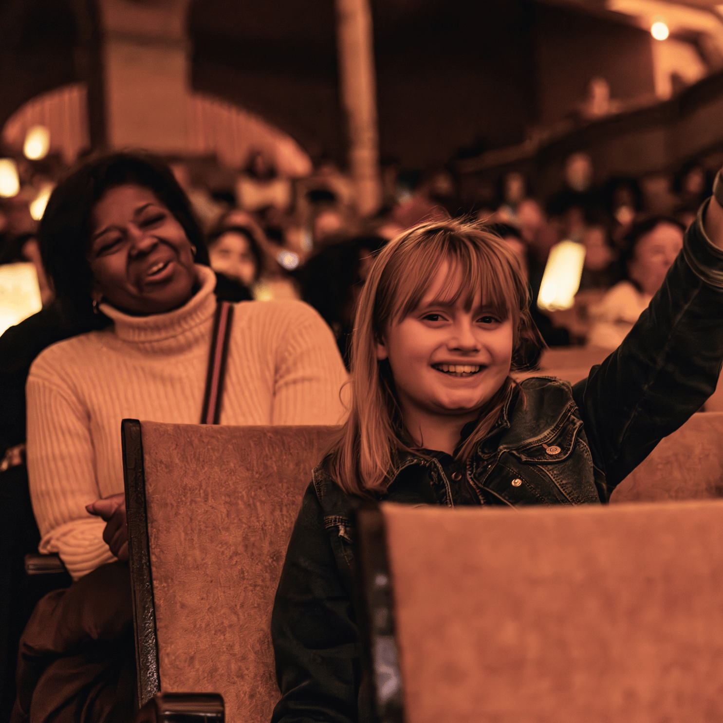 A child holding up a Luminaria in an auditorium. By Kyle Flubacker
